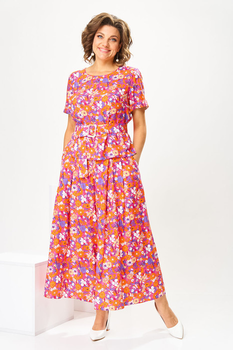 Костюм женский предназначен для повседневной носки. Костюм женский 2-х предметный блузка и юбка-брюки. Блузка женская прямого силуэта, длиной до линии бёдер. Перед с 2-мя нагрудными вытачками. Спинка с отрезной кокеткой, с 1-ной встречной складкой, кокетка декорирована пришивной металлической пластиной. Боковые швы с разрезами. Горловина круглая, обточная, без воротника. Рукав втачной одно шовный, короткий, с приточной отложной манжетой. Блузка без плечевых накладок. Юбка-брюки длинные широкие. Передние половинки с карманами в боковых швах с 2-мя односторонними зафиксированными складками на каждой половинке. Задние без конструктивных особенностей. Пояс притачной, собран на эластичную тесьму, закреплённую 2-мя отделочными строчками. Длина брюк по боковому срезу 90 см. Длина спинки блузона 56 см, длина рукава 22 см.