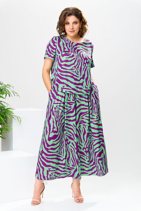Костюм женский предназначен для повседневной носки. Костюм женский 2-х предметный блузка и юбка-брюки. Блузка женская прямого силуэта, длиной до линии бёдер. Перед с 2-мя нагрудными вытачками. Спинка с отрезной кокеткой, с 1-ной встречной складкой, кокетка декорирована пришивной металлической пластиной. Боковые швы с разрезами. Горловина круглая, обточная, без воротника. Рукав втачной одно шовный, короткий, с приточной отложной манжетой. Блузка без плечевых накладок. Юбка-брюки длинные широкие. Передние половинки с карманами в боковых швах с 2-мя односторонними зафиксированными складками на каждой половинке. Задние без конструктивных особенностей. Пояс притачной, собран на эластичную тесьму, закреплённую 2-мя отделочными строчками. Длина брюк по боковому срезу 90 см. Длина спинки блузона 56 см, длина рукава 22 см.