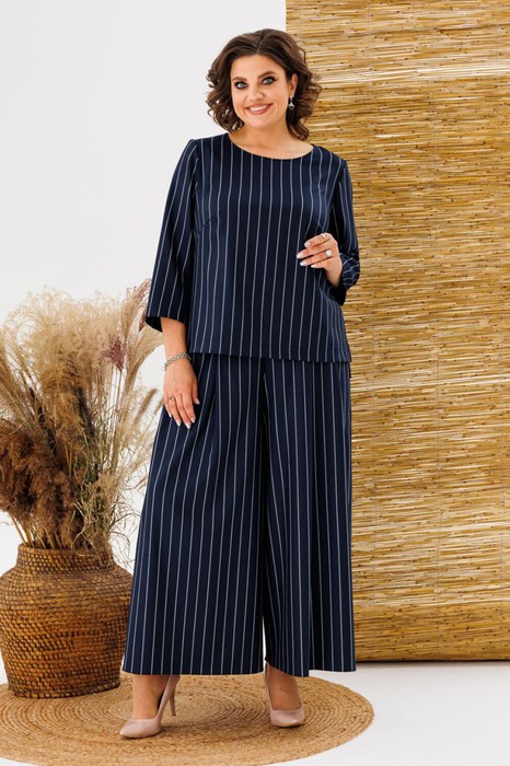 Костюм женский предназначен для повседневной носки. Костюм женский 2-х предметный блузон и юбка-брюки. Блузон прямого силуэта, длиной до линии бёдер с низом "ступенька". Перед с 2-мя нагрудными вытачками. Спинка цельнокроеная. Горловина круглая, обточная, без воротника. Рукав втачной, 2-х шовный, длиной 3/4. Блузон без плечевых накладок. Юбка-брюки длинные, широкие. Передние половинки с карманами в боковых швах с 2-мя зафиксированными односторонними складками с каждой стороны. Задние половинки без конструктивных особенностей. Юбка-брюки с приточным поясом, собранным частично на эластичную тесьму, закреплённую 2-мя отделочными строчками. К костюму прилагается съёмный пояс с пряжкой и 2-ю пробивными блочками. Длина брюк по боковому срезу 93см. Длина спинки блузона 64 см, длина рукава 49 см.