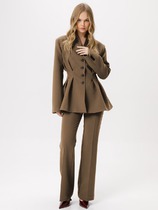 Костюм женский, предназначен для повседневной носки. Костюм женский, 2-х предметный блузка и брюки. Блузка женская, удлинённая прямого силуэта, длиной до середины колена. Перед с 25-мя нагрудными вытачками, выходящими из плечевых швов, с 2-мя накладными прямоугольными карманами на уровне груди, левый декорирован пришивным украшением, с 2-мя притачными вертикальными планками по горловине и краю борта. Спинка с отрезной кокеткой и встречной складкой по центру. Горловина с V-образным фигурным вырезом с втачным воротником рубашечного типа с отрезной стойкой. Застёжка центральная на 5-ть вертикально-обмётанных петель и 5-ть пришивных пуговиц. Боковые швы с высокими разрезами. Рукав втачной одно шовный длиной 7/8 с патой, фиксирующейся на пришивную пуговицу и регулирующей длину рукава. Блузка с плечевыми накладками. Брюки женские прямые широкие длинные. Передние половинки с карманами в боковых швах с отрезными бочками. Задние половинки с таллиевыми вытачками. Брюки с притачным поясом, собранным на эластичную тесьму, закреплённую 2-мя отделочными строчками. Длина брюк по боковому срезу 106 см. Длина спинки туники 100 см, длина рукава 50 см.