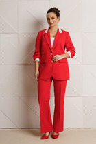 Костюм женский, 2-х предметный, блузка и брюки. Блузка женская, прямого силуэта, длиной ниже линии бёдер, с фигурным низом "ступенька". Перед цельнокроенный, с настрочным декором слева, с настрочной отделочной тесьмой. Спинка цельнокроенная. Горловина круглая, обточная, без воротника, длиной до локтя с притачной манжетой из отделочной ткани. Боковые швы с разрезами. Блузка без плечевых накладок. Брюки женские, прямые, длинные. Передние половинки с карманами в боковых швах. Задние половинки без конструктивных особенностей. Брючки с притачным поясом, собранным на эластичную тесьму (частично) и закреплённую 2-мя отделочными строчками. Длина спинки блузки 68,5 см, длина рукава 49 см. Длина брюк 105 см.