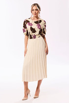 Костюм женский относится к нарядной торжественной одежде. Костюм женский, 2-х предметный, блузка и брюки. Блузка женская, прямого силуэта, свободного кроя, длиной до линии бёдер. Перед и спинка цельнокроенные. Горловина фигурная, обтачная, без воротника. Рукав цельнокроеный, длиной за локоть, с притачной манжетой из отделочной ткани, правый-с подрезом и обтачной бретелью из отделочной ткани с декоротивной тесьмой (цепь). Боковые швы с разрезами. Блузка без плечевых накладок. Брюки женские прямые, длинные. Передние половинки с карманами а боковых швах. Задние половинки с таллиевыми вытачками. Брюки с притачным поясом собранным на эластичную тесьму, закреплённую 2-мя отделочными строчками. Длина брюк по боковому срезу 105 см, длина брюк по шаговому шву 77 см. Длина спинки блузки 65 см, ширина рукава 23 см.