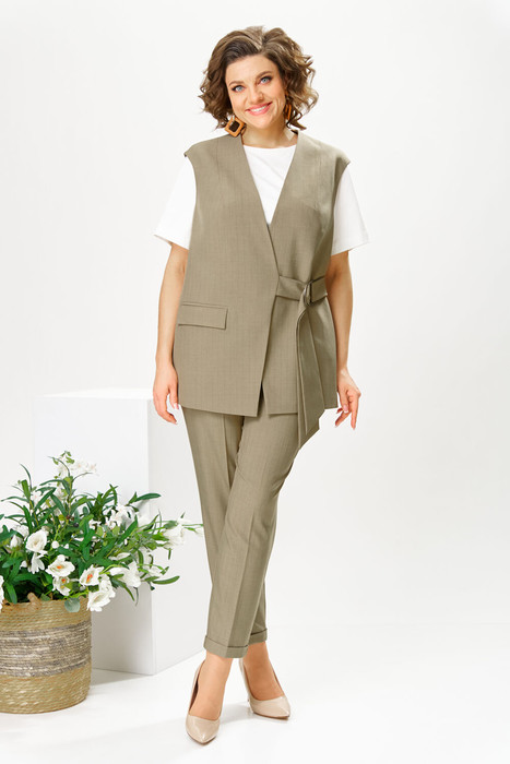 Комплект женский предназначен для повседневной носки. Комплект женский 3-х предметный, жилет, блузка и брюки. Жилет прямого силуэта, длиной ниже линии бёдер на 15 см. Перед с 2-мя нагрудными вытачками, выходящими из плечевых швов, с прорезным карманом с клапаном и 2-мя обтачками на правой части. Спинка со средним швом, заканчивающимся шлицей. Горловина с V-образным вырезом. Застёжка 2-х бортная на потайную петлю и пуговицу и на пояс, закреплённый на уровне линии талии и металлическую пряжку. Проймы обтачные. Жилет на притачной подкладке. Блузка женская прямого силуэта, длиной ниже линии бёдер на 5 см. Перед с 2-мя нагрудными вытачками. Спинка цельнокроеная. Горловина круглая с втачной планкой. Рукав втачной, короткий, одно шовный. Блузка без плечевых накладок. Брюки женские слегка заужены к низу, длиной 7/8. Передние половинки с односторонними складками и карманами в боковых швах, с отрезными бочками. Задние половинки с таллиевыми вытачками. Застёжка центральная на потайную тесьму-молнию. Брюки с притачным поясом, частично собранным на эластичную тесьму, с застёжкой на 1-ну горизонтальную обмётанную петлю и 1-ну пришивную пуговицу. Низ брюк с отложной манжетой, закреплённой по боковому шву. Длина спинки жакета 74,5 см. Длина брюк по боковому срезу 98 см. Длина спинки блузки 63 см, длина рукава 25,5 см.