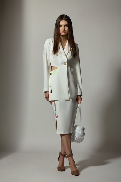 Комплект из костюмной ткани на подкладке, состоящий из жакета и юбки. Жакет приталенного силуэта. Верхняя часть переда с рельефами, вытачками. В левой части переда - прорезной карман в рамку. В правой нижней части переда отлетная деталь, застегивающаяся на пуговицу. Спинка с рельефами, отрезная по линии талии. Жакет застегивается на пуговицу и внутреннюю кнопку. Жакет декорирован цветными булавками. Юбка на подкладке, слегка зауженная к низу, без пояса. Верх юбки обработан обтачкой. В рельефе юбки разрез, обеспечивающий свободу движения и щель, декорированная булавкой. Застежка - молния в среднем шве юбки.