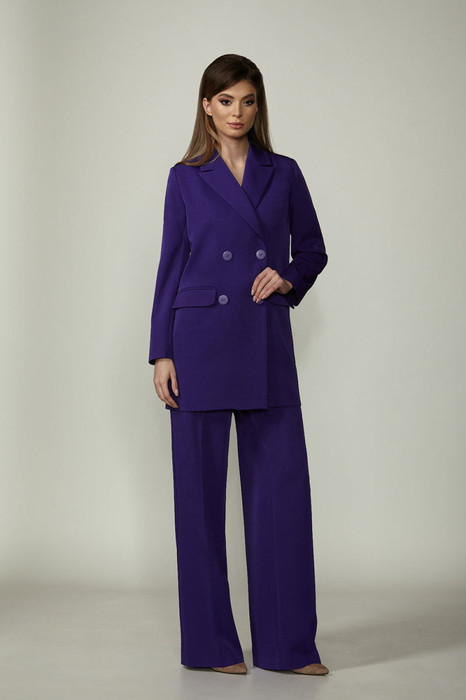 Брючный комплект из костюмной ткани на подкладке. Двубортный жакет выполнен в стиле оверсайз.  Воротник-с отложными лацканами пиджачного типа, рукава – двухшовные. По переду- прорезные карманы с клапанами. Жакет имеет  два ряда пуговиц, застегивается на две основные пуговицы, одну потайную, остальные пуговицы несут декоративный характер. Брюки прямые со складкой, широким поясом-обтачкой, наклонными карманами. Застегиваются на молнию по переду  и пуговицу.