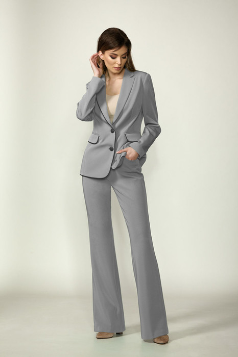 Классический брючный комплект из костюмной ткани на подкладке. Жакет приталенного силуэта с прорезными карманами с клапанами по переду. Воротник-английский, рукава - двухшовные. Кант по краю борта, клапанам   добавит  стиля и элегантности. Застегивается на две пуговицы.    Брюки-клеш  расширены к низу, с началом расширения выше колена 5 см. Брюки с двумя карманами и поясом-обтачкой.  Застегиваются на молнию по переду и  одну пуговицу.