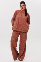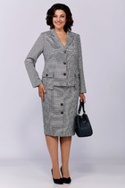 Брючный комплект из костюмной ткани на подкладке. Двубортный жакет выполнен в стиле оверсайз. Воротник-с отложными лацканами пиджачного типа, рукава – двухшовные. По переду- прорезные карманы с клапанами. Жакет имеет два ряда пуговиц, застегивается на две основные пуговицы, одну потайную, остальные пуговицы несут декоративный характер. Изюминка комплекта - декоративная булавка розового цвета. Брюки прямые со складкой, широким поясом-обтачкой, наклонными карманами. Застегиваются на молнию по переду и пуговицу.