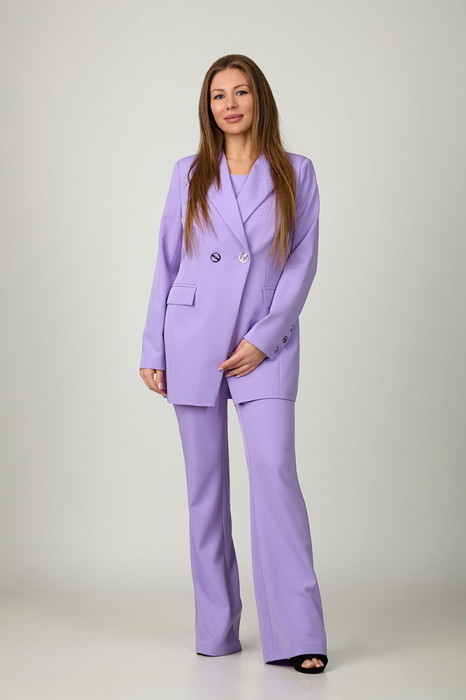 Брючный комплект из костюмной ткани на подкладке. Двубортный жакет полуприталенного силуэта с отрезными бочками и вытачками по переду и спинке. Воротник-с отложными лацканами пиджачного типа. По переду - прорезные карманы с клапанами. Рукава длинные, двухшовные. Жакет застегивается на две пуговицы. Брюки-клеш, плотно сидящие по фигуре, с началом расширения 5см выше колена. Брюки с карманами по переду и обтачкой-поясом. Застегиваются по переду на молнию и пуговицу.