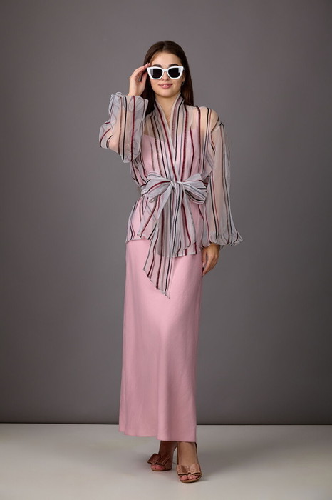 Комплект, состоящий из блузы и платья-комбинации. Прозрачная блуза из вуали  немного расширена к низу, с планкой по горловине и бортам.  Рукава-балон. Завязывается на пояс. Платье-комбинация из плотного атласа. Крой выполнен по косой, что обеспечит великолепную посадку на фигуре. Бретели  регулируемые.