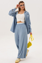 Двубортный жакет прямого силуэта с вытачками по переду. Карманы с листочками. Воротник - пиджачного типа. В среднем шве спинки - планка, застегивающаяся на пуговицы. Рукава - втачные, двухшовные. Застежка на 2 пуговицы и одну потайную. Цветок-брошь входит в комплект. Широкие брюки с поясом и карманами. По бокам пояса-резинка.Застегиваются по переду на молнию и пуговицу.