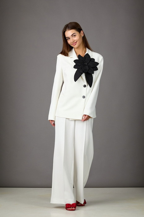 Двубортный жакет прямого силуэта с вытачками по переду. Карманы с листочками. Воротник - пиджачного типа. В среднем шве спинки - планка, застегивающаяся на пуговицы. Рукава - втачные, двухшовные. Застежка на 2 пуговицы и одну потайную. Цветок-брошь входит в комплект. Широкие брюки с поясом и карманами. По бокам пояса-резинка.Застегиваются по переду на молнию и пуговицу.