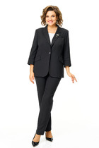 Брючный костюм из костюмной ткани на подкладке. Жакет приталенного силуэта с прорезными карманами с клапанами по переду. Воротник-английский, рукава - двухшовные. Застегивается на две пуговицы. Брюки слегка заужены к низу, с поясом. Посадка- средняя. Застегиваются на молнию по переду и одну пуговицу. Серебряный кант по краю борта, клапанам и боковым швам брюк добавит стиля и элегантности.