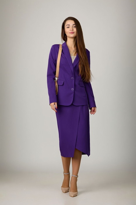 Комплект из костюмной ткани на подкладке, состоящий из жакета и юбки. Жакет приталенного силуэта с прорезными карманами с клапанами по переду. Воротник-английский, рукава - двухшовные. Кант по краю борта, клапанам. Застегивается на две пуговицы. Юбка на подкладке, слегка зауженная к низу, с отлетной деталью и поясом-обтачкой. Молния, шлица в среднем шве заднего полотнища юбки.