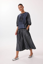 Юбка на подкладке, слегка зауженная к низу, без пояса. Верх юбки обработан обтачкой. Шлица в среднем шве заднего полотнища юбки обеспечит свободу движения. Застежка - молния в среднем шве юбки.