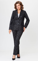 Брючный комплект из костюмной ткани на подкладке. Двубортный жакет полуприталенного силуэта с отрезными бочками и вытачками по переду и спинке. Воротник-с отложными лацканами пиджачного типа. По переду - прорезные карманы с клапанами. Рукава длинные, двухшовные. Жакет застегивается на две пуговицы. Брюки узкие, с двумя карманами и поясом-обтачкой. Застегиваются на молнию по переду и одну пуговицу.