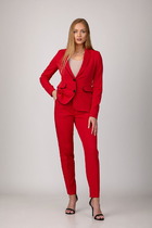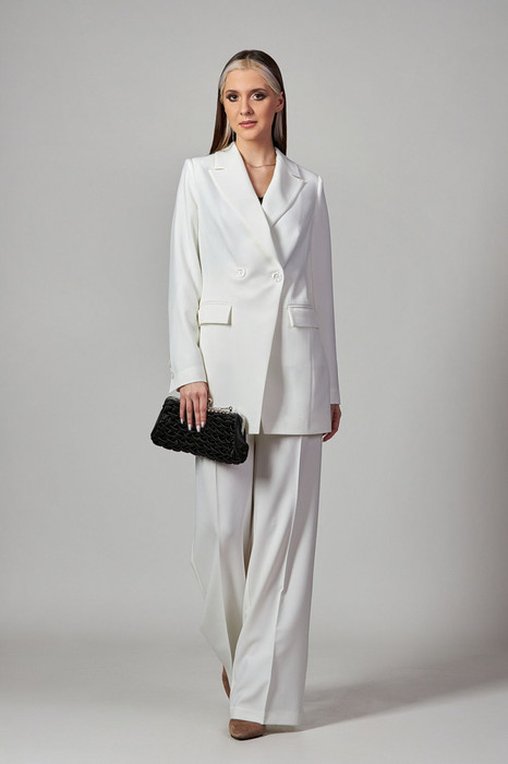 Брючный комплект из костюмной ткани на подкладке. Двубортный жакет полуприталенного силуэта с отрезными бочками и вытачками по переду и спинке. Воротник-с отложными лацканами пиджачного типа. По переду - прорезные  карманы  с клапанами. Рукава длинные, двухшовные. Жакет застегивается на две пуговицы. Брюки прямые со складкой, широким поясом-обтачкой, наклонными карманами. Застегиваются на молнию по переду  и пуговицу.