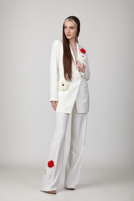 Брючный комплект из костюмной ткани на подкладке. Двубортный жакет полуприталенного силуэта с отрезными бочками и вытачками по переду и спинке. Воротник-с отложными лацканами пиджачного типа. По переду - прорезные карманы с клапанами. Рукава длинные, двухшовные. Жакет застегивается на две пуговицы. Жакет декорирован цветами-брошами ручной работы. Брюки прямые со складкой, широким поясом-обтачкой, наклонными карманами. Застегиваются на молнию по переду и пуговицу.