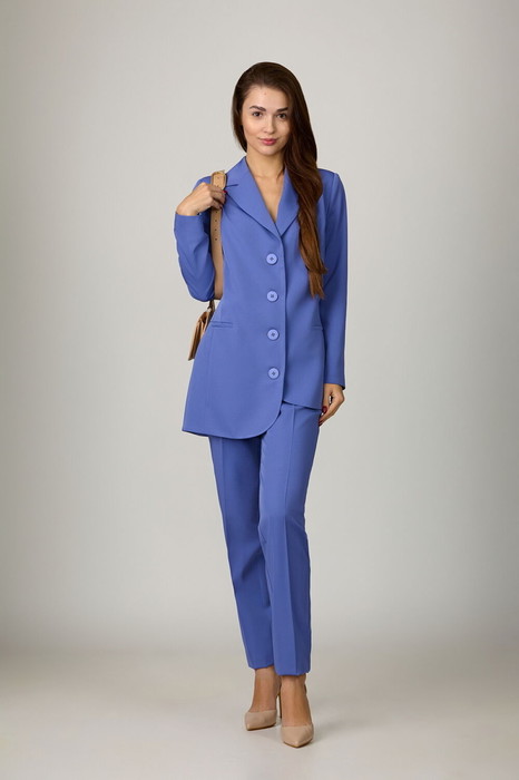 Стильная брючная пара из костюмной ткани на подкладке. Жакет слегка притален, с рельефами по переду и спинке и прорезными карманами с листочками  по переду. Воротник-английский, рукава - двухшовные. Низ переда и спинки жакета асимметричен. Шлица на спинке декорирована пуговицами. Жакет застегивается на пуговицы. Брюки  слегка заужены к низу, с поясом.  Посадка-средняя.Застегиваются на молнию по переду и  одну пуговицу.