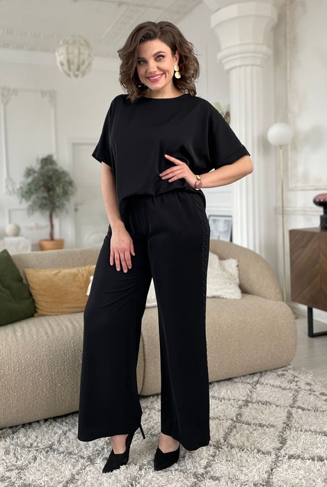 Брюки женские из текстильной ткани ,прямого силуэта. По боковым швам вставленно кружево. Пояс брюк на резинке.
