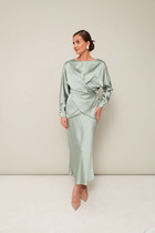 Блузка женская из тесктильной ткани,прямого силуэта. Спинка со средний швом, спущенное плечо переходящее в манжету. Вырез горловины оформлен стойкой. Перед блузы по длине короче спинки.