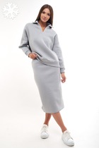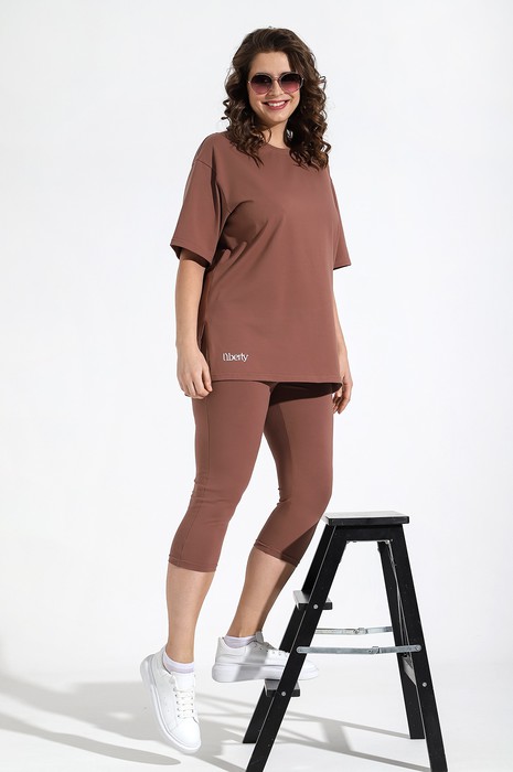 Костюм женский из трикотажного гладкокрашенного полотна «кулирка с лайкрой», состоящий из футболки и бридж. Футболка свободного покроя, со спущенным плечом и втачными рукавами длиной до локтя, горловиной овальной формы, обработанной втачной планкой и принтом на полочке, выполненным в технике «шелкографии». В нижней части боковых швов – разрезы.Бриджи – классического покроя, на резинке.