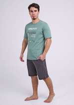 Мужской костюм из кулирки футболка + брюки. Футболка с принтом в виде цифр и надписи, короткие рукава, V-образная горловина. Однотонные темные шорты, принт в виде цифр, по бокам карманы, длина до коленей. Размеры от 46 до 56. Имеется возможность розничного заказа.