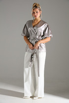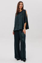 Брюки прямого силуэта, на притачном поясе. В боковых швах наклонные карманы. На задних половинках таливые вытачки. Застежка – гульфик на молнию спереди. Пояс застегивается на пуговицу. По низу брюк в боковых швах шлица с застежкой на петли и пуговицы.