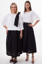 Брюки укороченные (кюлоты) прямого силуэта, со стрелками. По низу брюк в боковых швах шлица, с застежкой на петли и пуговицы. По задней части пояса резиновая тесьма для удобства посадки на талии.