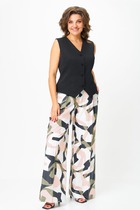 Комплект женский, 2х предметный, состоящий из рубашки и брюк. Рубашка прямого силуэта с длинным рукавом. Рукав двухшовный, со спущенной линией плеча, по низу на манжете. Застежка манжеты на кнопку. Горловина оформлена рубашечным воротником. Застежка центральная на кнопки. Перед задекорирован вышивкой с паетками. По спинке кокетка с отделочной нашивкой. Низ рубашки разноуровневый, по спинке длиннее. По бокам разрезы. Брюки прямые, с накладными карманами спереди. Пояс притачной с резинкой по кругу.