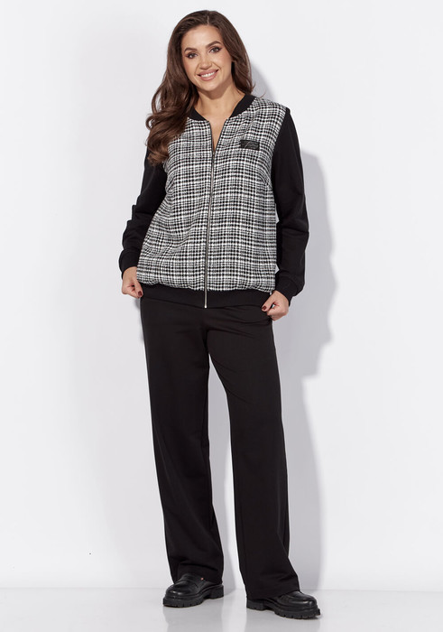 Комплект женский, 2х предметный, состоящий из бомбера и брюк. Бомбер прямого силуэта, изготовлен из текстильной ткани в клетку (букле) и трикотажного полотна. По переду нагрудные вытачки, отделочная нашивка. Карманы в боковых швах. Застежка центральная на тесьму "молния" Вырез горловины круглой формы с подрезной бейкой. Бейка горловины, манжеты рукавов и низа изделия из эластичного трикотажного полотна (кашкарсе)