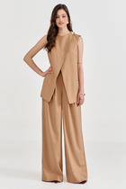Комплект женский, 2х предметный, состоящий из джемпера и брюк. Комплект выполнен из двух видов трикотажного полотна и отделойной текстильной ткани. Джемпер прямого силуэта с длинным рукавом. Рукав со спущенной линией плеча, снизу на манжете. По переду и спинке горизонтальный подрез, со сменой ткани и отделочной нашивкой спереди. По рукаву вставка треугольной формы из отделочной ткани. Горловина круглой формы с подрезной бейкой. Низ присобран на регулируемую кулису. Брюки прямые, свободные, по низу на манжете, частично с резинкой. По бокам вставки треугольной формы из отделочной ткани. Спереди функциональные карманы. Пояс притачной, с резинкой сзади и частично по переду.