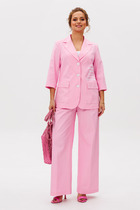 Комплект женский, 2х предметный, состоящий из джемпера и брюк. Джемпер прямого силуэта с рукавом длинной 7/8. Рукав со спущенной линией плеча и отрезной манжетой по низу. Горловина круглой формы, с подрезной планкой по переду. По бокам разрезы. Акцентом служит накладной карман по переду, задекорированный вышивкой и принтом. Брюки прямые, с наклонными карманами спереди. Пояс притачной, с резинкой по кругу.