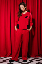 Универсальный женский комплект, состоящий из брюк, футболки и жакета. Каждый из предметов можно носить отдельно. Выразительность и актуальность комплекту придают стилизованный спортивный стиль в сочетании с интересными декоративными элементами.