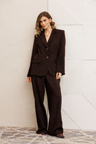 Жакет полуприлегающего силуэта с центральной застёжкой на планку(6 петель и пуговиц). На переде обработаны кокетки, нагрудные вытачки, рельефные швы, карманы с листочками в швах, накладные карманы. Спинка с кокеткой, средним швом, рельефными швами. Рукав втачной, двухшовный, с разрезом в локтевом шве, по низу с заложенной складкой и манжетой на пуговице. Воротник стояче-отложной с отрезной стойкой.