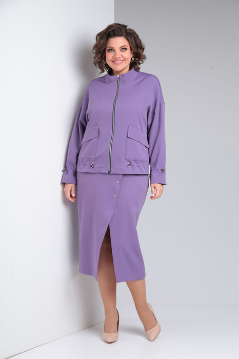 Универсальный трёхпредметный комплект, состоящий из жакета-ветровки, юбки, футболки. Каждый из предметов можно носить отдельно, составляя новые образы. Комфортная футболка со спущенным рукавом выполнена из мягкого вискозного трикотажа. На переде обработаны нагрудные вытачки, декором служит стильный дизайнерский принт.