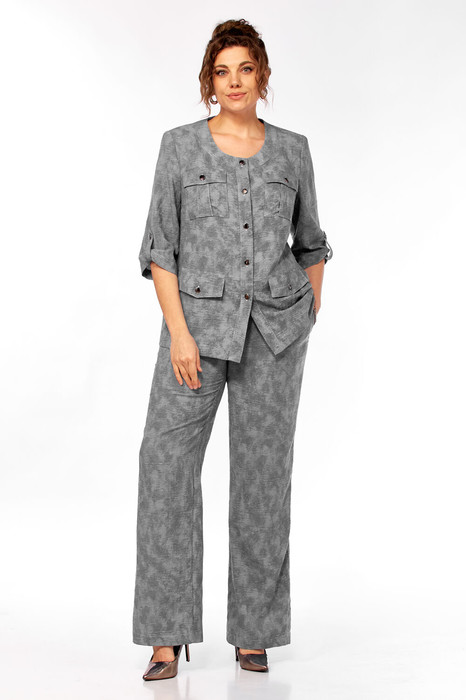 Стильный летний комплект, состоящий из жакета и брюк. Идеальное сочетание удобства и элегантности для Вашего гардероба. Лёгкий хлопок «варёнка» с крэш-эффектом сохраняет комфортный микроклимат в жару, за счёт своей фактуры помятости не требует утюжки. Жакет свободного силуэта с центральной застёжкой-планкой на 5 петель и пуговиц. Перед жакета с кокетками, планками горловины, нагрудными вытачками, накладными карманами, горизонтальными подрезами, отделочными клапанами. Спинка с кокеткой, рельефными швами. Рукав втачной, одношовный, внизу присобран патой. Горловина округлой формы. Брюки прямые, на поясе с резинкой и протянутым шнурком из основной ткани. На передних половинках обработаны функциональные карманы.