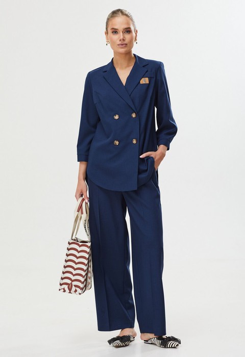 Костюм состоит из жакета и брюк. Качественная ткань лен вишер, из которой выполнена модель, обеспечит долговечность изделию и приятные ощущения его обладательнице. Жакет без подкладки прямого силуэта, с двубортной застежкой на петли-пуговицы, длиной до середины бедра. Перед жакета с нагрудными вытачками, в области груди расположена декоративная листочка и нашивка. Спинка с двойной кокеткой, в шве притачивания которой обработана встречная складка. Низ жакета фигурный, с закруглениями по боковым швам. Рукава двушовные, длиной 3/4, по низу с манжетой, застегивающейся на петлю и пуговицу. Горловина оформлена воротником пиджачного типа. Брюки классической формы, прямые от линии бедер, со стрелками по передним и задним половинкам. Верхний срез обработан поясом, в который от бокового шва вставлена резинка по задним половинкам. В боковых швах обработаны наклонные карманы. На задних половинках расположены талиевые вытачки. В комплект входит узкий ремень из экокожи. В модели использована фурнитура контрастного цвета.