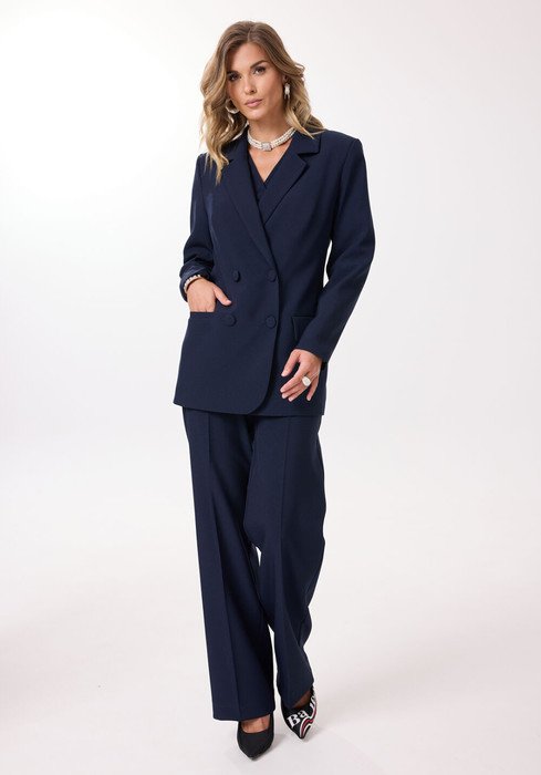 Костюм женский 3-х предметный, состоящий из жакета, брюк и жилета. Костюм выполнен из поливискозы. Жакет полуприлегающего силуэта, на подкладке, с двубортной застежкой на петли и пуговицы. Горловина жакета оформлена воротником пиджачного типа. Рукава двухшовные длинные с возможностью подворота длины. Перед с нагрудными вытачками, выходящими из рельефов. В области бедер обработаны прорезные карманы "в рамку" с клапаном. Спинка со средним швом и рельефами. Жилет полуприлегающего силуэта, на подкладке, с центральной застёжкой на петли и пуговицы. По переду талиевые вытачки, в области бедер настрочены декоративные листочки. Спинка  со средним швом и талиевыми вытачками. Низ переда жилета фигурный. Брюки классической формы, прямого силуэта, со стрелками по передним и задним половинкам. Верхний срез обработан притачным поясом. По центру переда - застёжка на крючок и тесьму-молнию. На задних половинках расположены талиевые вытачки и настрочены декоративные листочки. В боковых швах расположены наклонные карманы.
