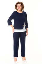 Комплект из двух предметов: блуза и брюки. Блуза женская жакетного типа, полуприлегающего силуэта, выполнена из струящейся поливискозы. Блуза с центральной застёжкой на петли и пуговицы. Горловина оформлена воротником пиджачного типа. Правая деталь переда блузы с нагрудной выточкой, левая - с вертикальным рельефом и подрезом, в области груди обработана декоративная листочка. Спинка цельнокроенная с талиевыми выточками. Рукав втачной длинный, низ рукава обработан притачной манжетой, которая застёгивается на 2 петли и пуговицы. Брюки классической формы, прямого силуэта, со стрелками по передним и задним половинкам. Верхний срез обработан обтачным поясом, дополнен практичными шлевками для ремня. На задних половинках расположены талиевые вытачки с настрочными декоративными листочками. В боковых швах брюк обработаны наклонные карманы. Застёжка центральная на тесьму-молнию и крючок. Брюки комплектуются ремнем.