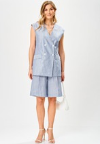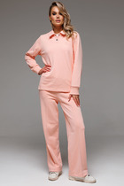 Комплект из двух предметов: блуза и брюки. Блуза женская жакетного типа, полуприлегающего силуэта, выполнена из струящейся поливискозы. Блуза с центральной застёжкой на петли и пуговицы. Горловина оформлена воротником пиджачного типа. Правая деталь переда блузы с нагрудной выточкой, левая - с вертикальным рельефом и подрезом, в области груди обработана декоративная листочка. Спинка цельнокроенная с талиевыми выточками. Рукав втачной длинный, низ рукава обработан притачной манжетой, которая застёгивается на 2 петли и пуговицы. Брюки классической формы, прямого силуэта, со стрелками по передним и задним половинкам. Верхний срез обработан обтачным поясом, дополнен практичными шлевками для ремня. На задних половинках расположены талиевые вытачки с настрочными декоративными листочками. В боковых швах брюк обработаны наклонные карманы. Застёжка центральная на тесьму-молнию и крючок. Брюки комплектуются ремнем.