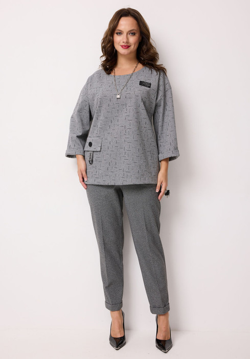 Костюм женский 2-х предметный, состоящий из блузы и брюк. Блуза выполнена из поливискозы с принтом "штрихи". Блуза длиной до середины бедра, прямого силуэта. Горловина круглой формы. Рукава двухшовные длиной 3/4, с манжетой. Перед с нагрудными вытачками, выходящими из бокового шва.  В области груди расположена декоративная нашивка. В области бедра настрочен клапан с декоративной тесьмой и пряжкой, который зафиксирован пуговицей. Спинка со средним швом и декоративной шлицей с пуговицами в верхней части спинки. По низу боковых швов обработаны разрезы. Брюки выполнены из полизивкозы однотонного компаньона. Брюки прямого силуэта, слегка заужены к низу. Них брюк с цельнокроеной манжетой. Брюки со стрелками по передним и задним половинкам.  Верхний срез обработан притачным поясом, в который вставлена резинка. По центру переда - застёжка-обманка. На задних половинках расположны талиевые вытачки. В боковых швах расположены наклонные карманы.