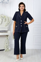 Жакет полуприлегающего силуэта, на подкладке, с центральной бортовой застежкой на 4 петли и 4 пуговицы (размер и цвет фурнитуры может незначительно отличаться от фото). Перед со смещенными рельефными швами, идущими из пройм вниз, с нагрудными вытачками, выходящими из рельефных швов к центрам, в нижних частях с прорезными карманами с клапанами. Спинка с рельефными швами и средним швом. Рукава втачные, двухшовные, длинные. Горловина оформлена воротником пиджачного типа. Концы воротника и лацканов закруглены. По воротнику, лацканам, бортам, клапанам прострочена отделочная строчка ш. 0,7 см.