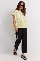 Костюм молодежный из тканого полотна в полоску, состоящий из блузы - рубашки и шорт. Блуза – укороченного силуэта, свободного покроя, с короткими цельнокроеными рукавами, обработанными манжетами, акцентными декоративными завязками спереди, отложным воротником и центральной бортовой застежкой на петли и пуговицы.Шорты - свободные, средней длины, с карманами в боковых швах, на притачном поясе с эластичной тесьмой внутри, с двойной подгибкой низа имитирующей манжет.
