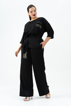 Костюм молодежный из тканого полотна в полоску, состоящий из блузы - рубашки и шорт. Блуза – укороченного силуэта, свободного покроя, с короткими цельнокроеными рукавами, обработанными манжетами, акцентными декоративными завязками спереди, отложным воротником и центральной бортовой застежкой на петли и пуговицы.Шорты - свободные, средней длины, с карманами в боковых швах, на притачном поясе с эластичной тесьмой внутри, с двойной подгибкой низа имитирующей манжет.