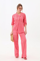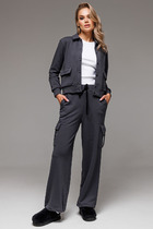 Костюм молодежный из тканого полотна в полоску, состоящий из блузы - рубашки и шорт. Блуза – укороченного силуэта, свободного покроя, с короткими цельнокроеными рукавами, обработанными манжетами, акцентными декоративными завязками спереди, отложным воротником и центральной бортовой застежкой на петли и пуговицы.Шорты - свободные, средней длины, с карманами в боковых швах, на притачном поясе с эластичной тесьмой внутри, с двойной подгибкой низа имитирующей манжет.