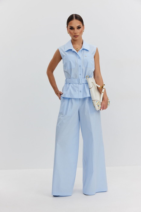 Блузка женская полуприлегающего силуэта, из хлопковой ткани с «креш»-эффектом. Спинка со средним швом. Застежка на планку и 6 петель и пуговиц, по переду накладные карманы, низ блузки на обтачке. Воротник рубашечный отложной. В комплекте пояс из основной ткани с декоративной пряжкой. Длина 55 см.