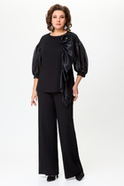 Костюм женский двухпредметный, состоящий из жакета и юбки. Жакет полуприлегающего силуэта с центральной бортовой застежкой на 5 петель-пуговиц. По переду обработаны нагрудные вытачки и по 3 защипа-складки по талии. Спинка со средним швом и двумя защипами-складками с двух сторон. Горловина V-образной формы, с цельнокроенной стойкой и с отрезным швом по спинке. Рукав втачной двухшовный длинный. Юбка заужена к низу, длиной за колено. Переднее полотнище с талиевыми вытачками. Заднее полотнище со средним швом, заканчивающимся шлицей, и с застежкой на потайную тесьму-молнию. Заднее полотнище также с талиевыми вытачками по 2 шт.