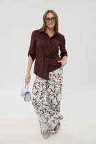 Брюки палаццо с притачным широким поясом на резинке от заутюженных стрелок по передней половинке вкруговую. Застежка на тесьму-молнию в средних срезах передних половинок брюк и 2 петли-пуговицы по поясу.