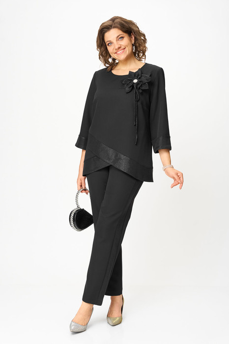 Стильный брючный костюм — сочетание аккуратной классики и модных деталей. Туника прямого силуэта с передом, имитирующим запах, и съемным цветком-брошью создаёт утончённый и интересный акцент. Рукав 3/4 прямого кроя с отложной манжетой из отделочной ткани, овальная горловина — удобно и стильно. У брюк проходит декоративный лампас из отделочной ткани; брюки заужены к низу, подчёркивают силуэт и подходят для разных типов фигуры.