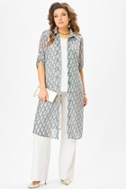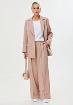 Костюм женский 3-х предметный, полуприлегающего силуэта. Состоит из жакета и жилета на подкладке и брюк. Жакет с воротником пиджачного типа, центральной застёжкой на 1 петлю и 1 пуговицу. Перед с рельефными швами от пройм до низа и талиевыми вытачками и прорезными карманами с листочками с втачными концами. Спинка со средним швом. Рукав втачной, двухшовный, длинный со шлицей. Жилет с рельефными швами от пройм до низа по переду и спинке, с центральной застёжкой на 4 петли и 4 пуговицы. Перед с прорезными карманами с листочками с втачными концами. Брюки с застёжкой на тесьму "молнию" в средних срезах передних половинок, с притачным поясом на 1 петлю и 1 пуговицу и резинкой по задним половинкам, с карманами наклонными к боковым швам. По передним и задним половинкам заутюженные канты. Длина жакета по спинке - 70 см. Длина рукава - 61 см. Длина жилета по спинке - 53 см. Длина брюк по боковому шву - 101 см.